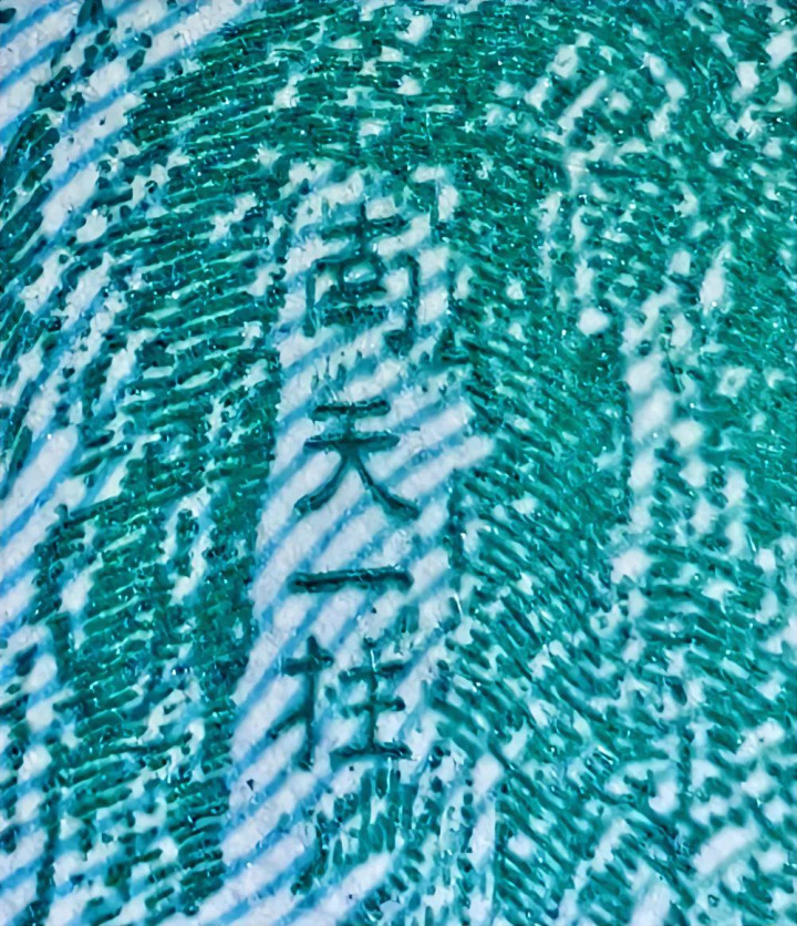 902"南天门"与绿幽南天同既有共同之处,也有荧光的辨认,还有2元卷后面波澜的辨认。得出荧光不同+后面波浪不同+ (印制厂家不同,活水号划定不同)。共同之处王人是南天门一柱,"南"字"王人有启齿断线标识。